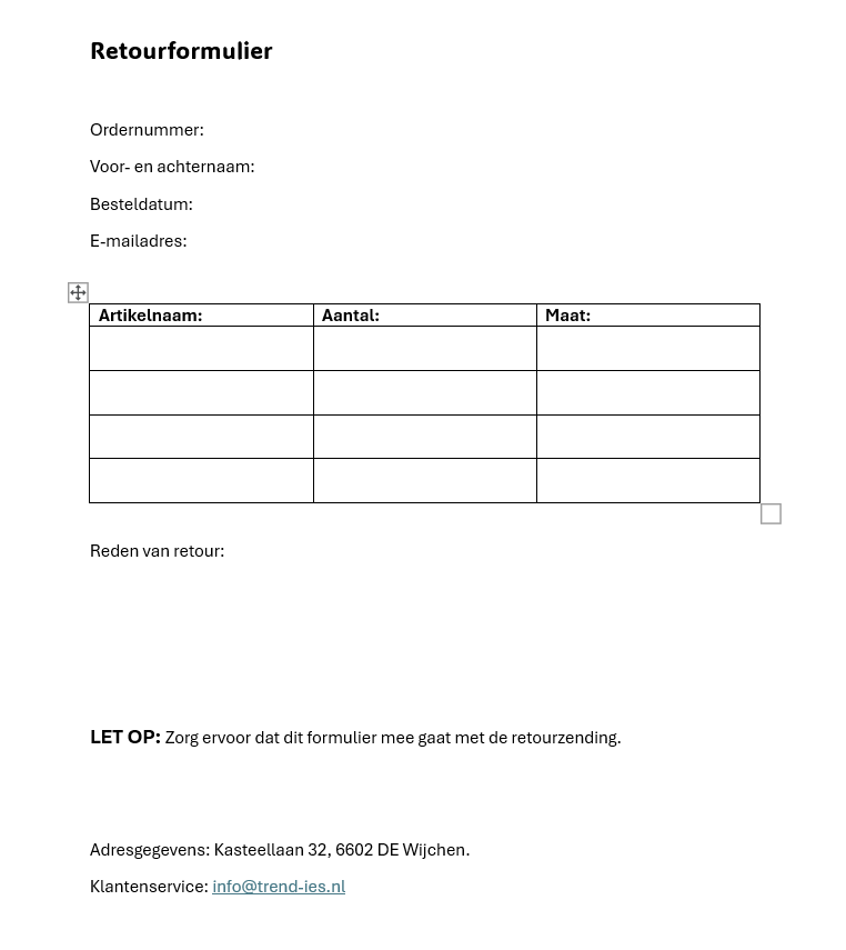 De kosten voor het retourneren zijn voor eigen rekening. Stuur altijd het retourformulier (onderaan de pagina) mee voor een snelle afhandeling van jou retour.